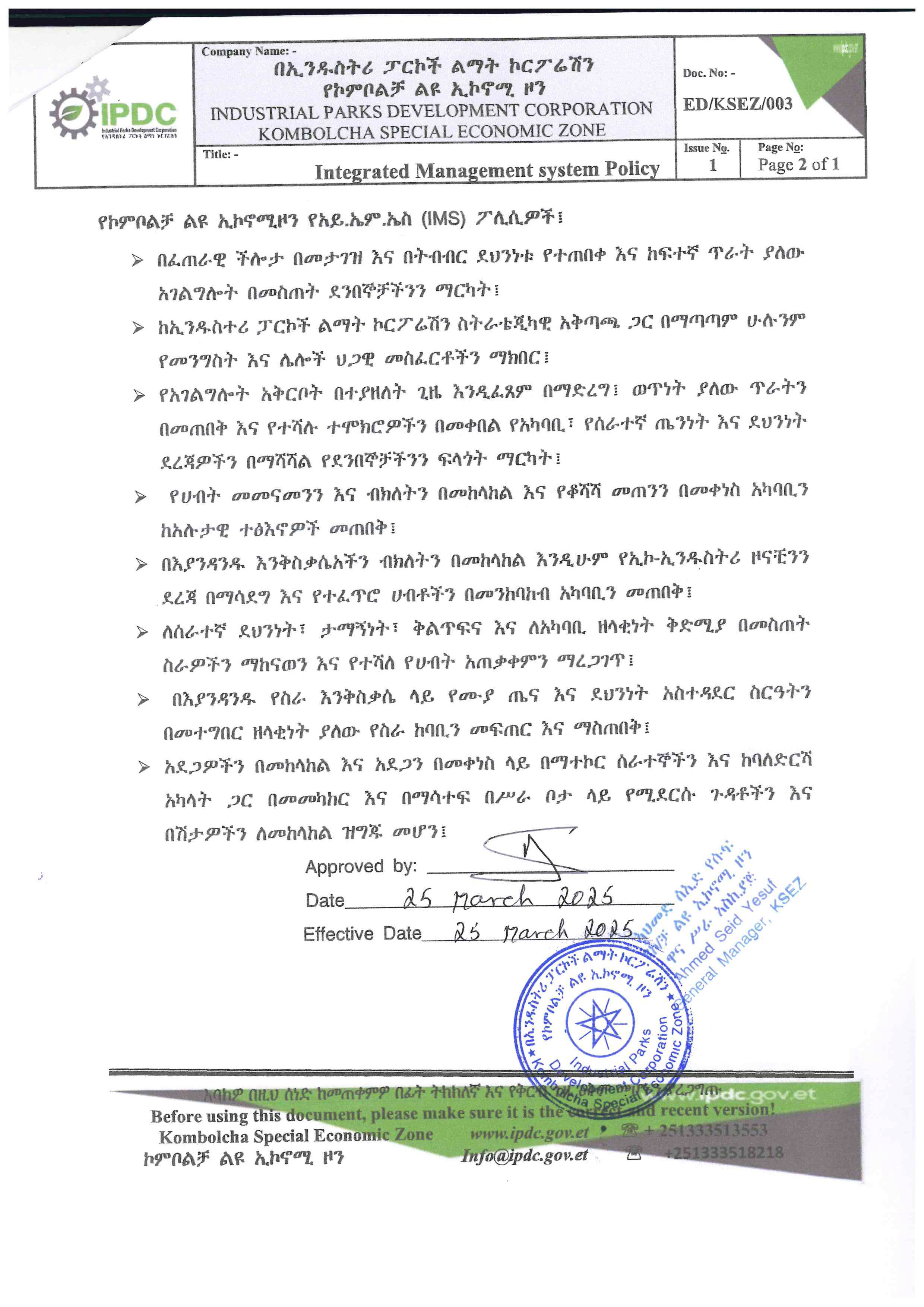 የኮምቦልቻ ልዩ የኢኮኖሚ ዞን የተቀናጀ ስራ አመራር ስርዓት ፖሊሲ